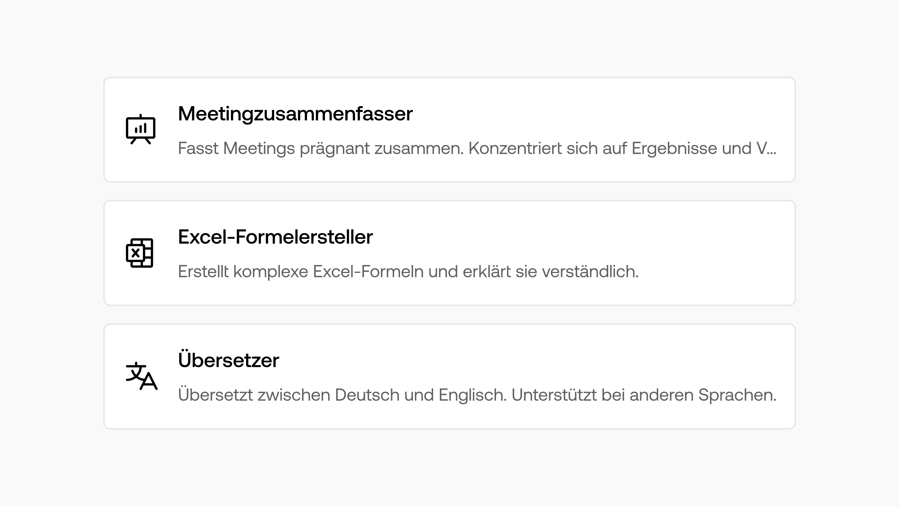 | Zeitaufwand | Prompt bei jeder Nutzung schreiben | Sofort starten, kein Prompt nötig |